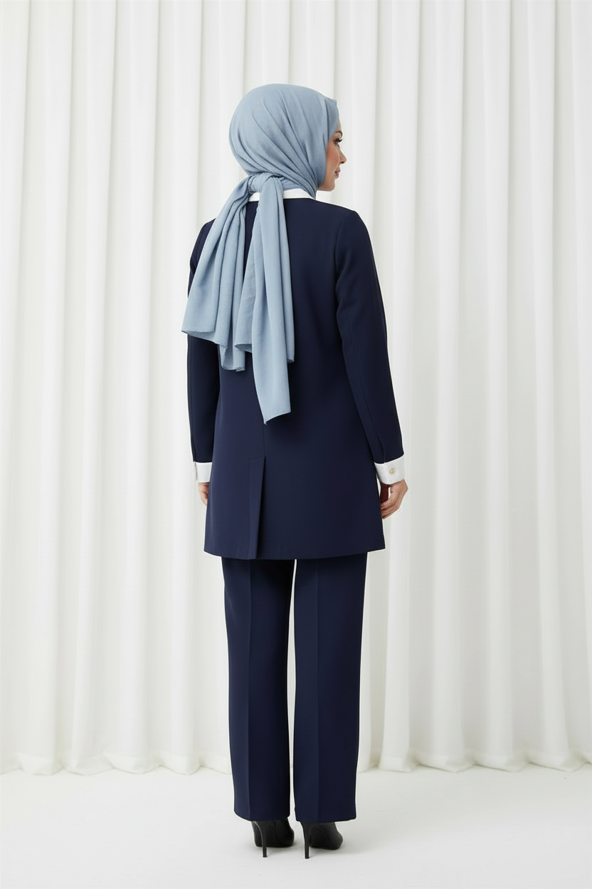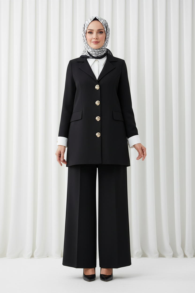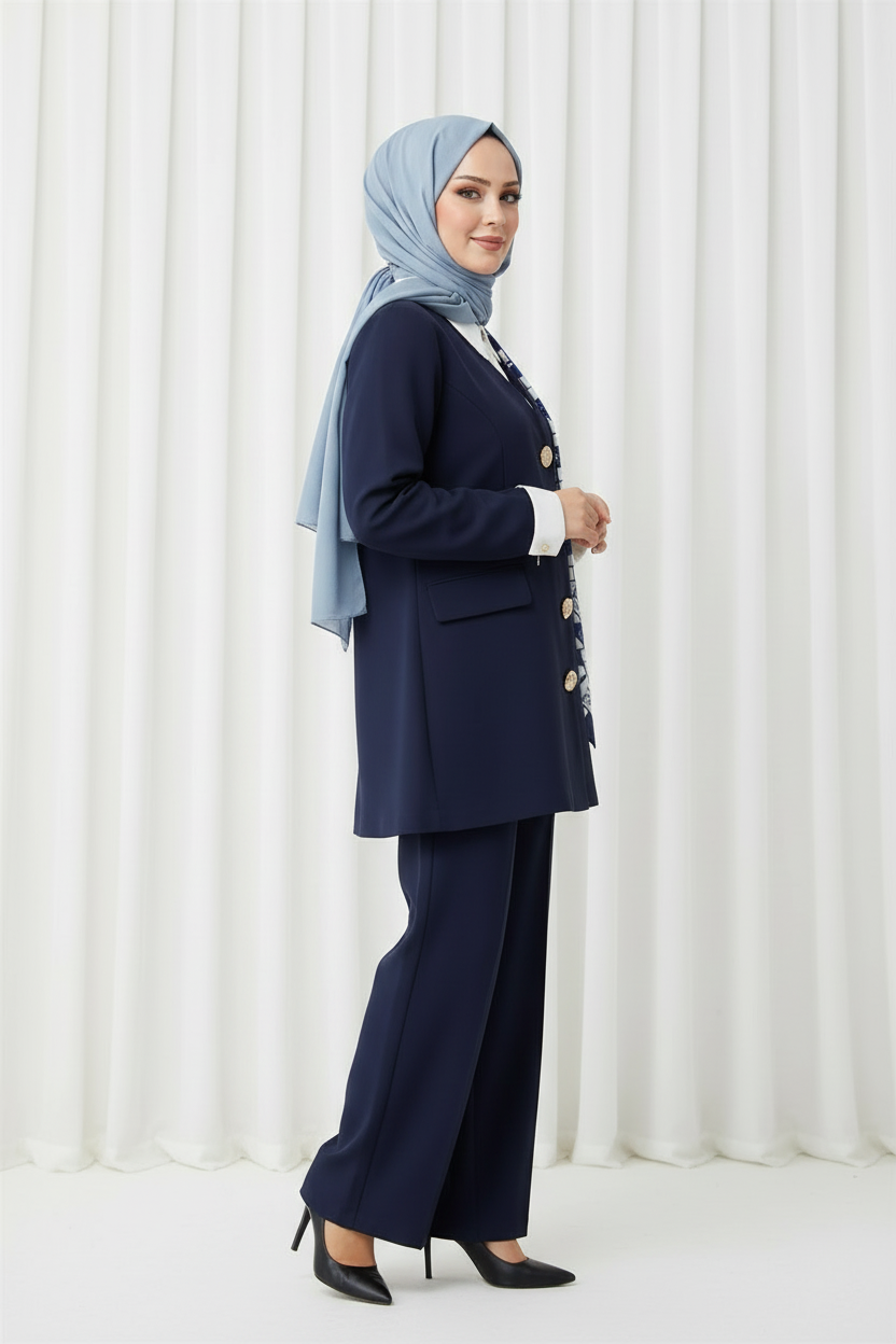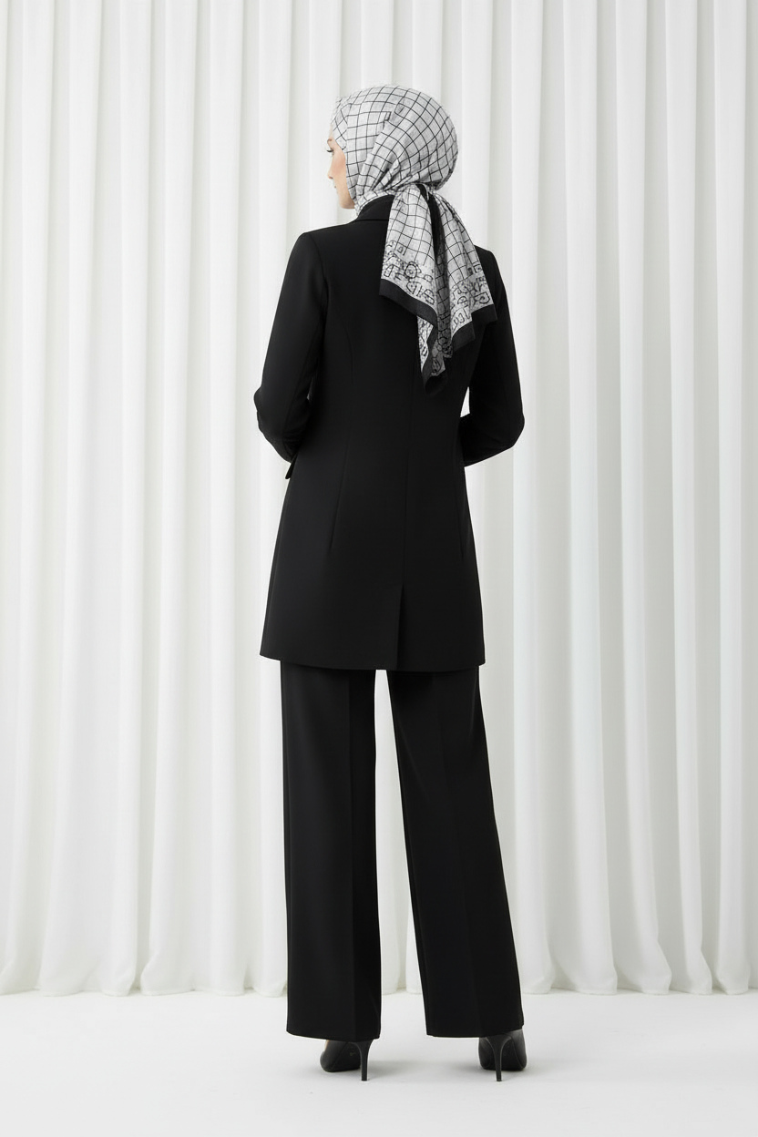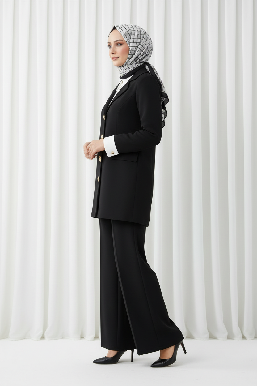 Eşarplı Kol Düğmeli Ceket Takım, zarif eşarp detayı ve kol düğmeli şık ceket tasarımıyla modern ve sofistike bir görünüm sunar. Rahat kesimi sayesinde gün boyu konfor sağlarken, özel günlerde ve günlük kombinlerde stilinizi tamamlayan şık bir tercih olur.