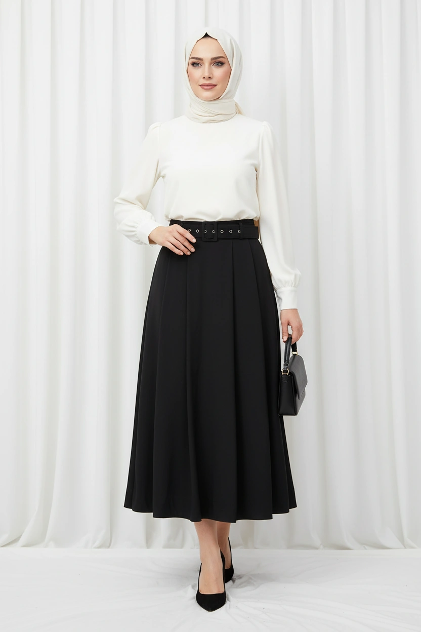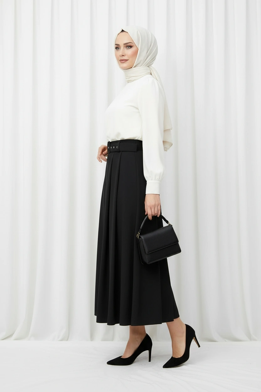 Siyah Kemer Detaylı Pileli Etek