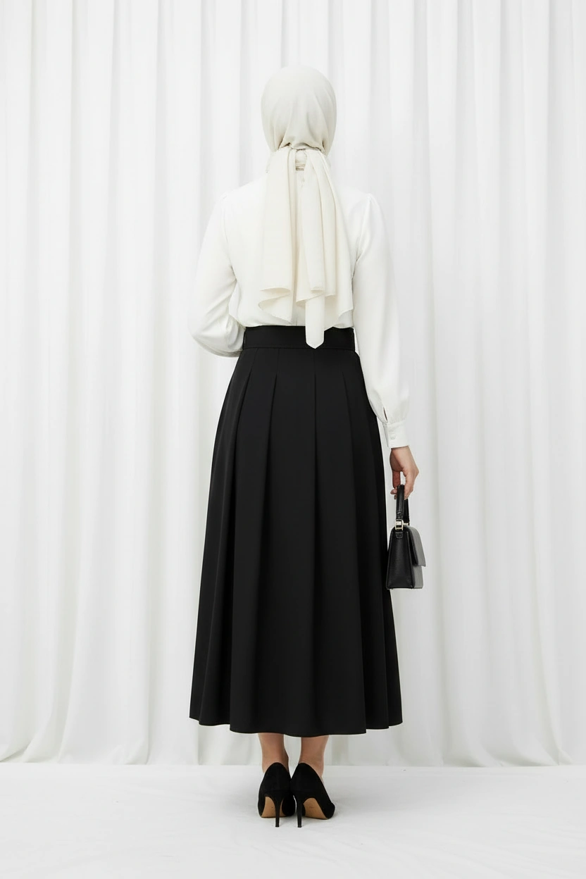 Siyah Kemer Detaylı Pileli Etek, zarif pile formu ve şık kemer detayıyla hem günlük hem de özel kombinlerde stilinizi ön plana çıkarır. Akıcı yapısı ve modern kesimi sayesinde feminen ve dengeli bir siluet sunar.