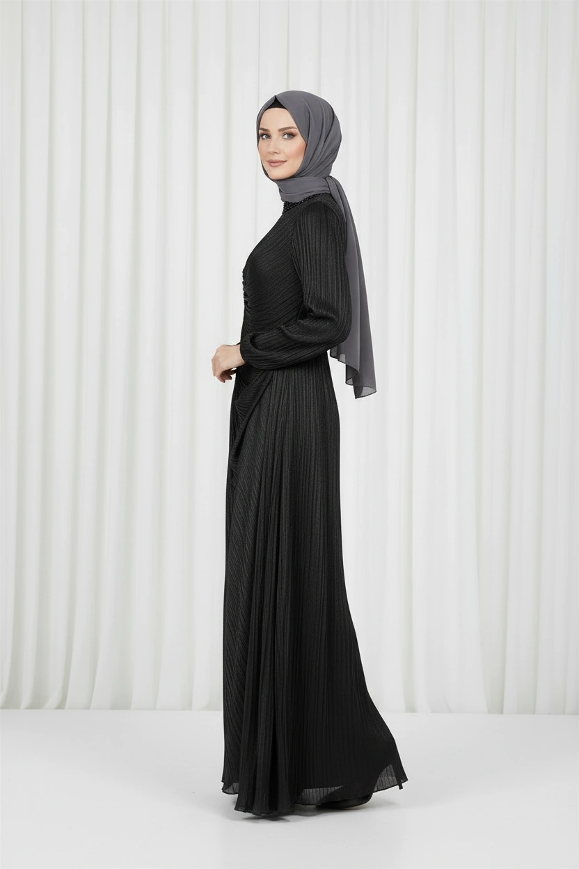 Yandan taş detaylarıyla hareket kazanan bu siyah abiye, özel günlerde tüm dikkatleri üzerinize çekmeniz için tasarlandı. Zarif kesimi ve ışıltılı detaylarıyla hem sade hem de göz alıcı bir görünüm sunar.